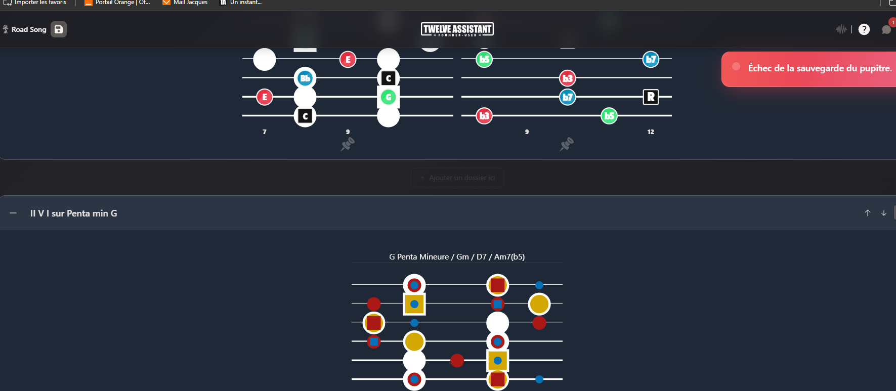D’abord j’épingle la zone puis Je fais effectivement le copier glisser pour passer de mes manches épinglés au dossier II V I sur penta min G .Mais quand je veux sauvegarder le pupitre j’ai ce voyant rouge d’Echec de sauvegarde