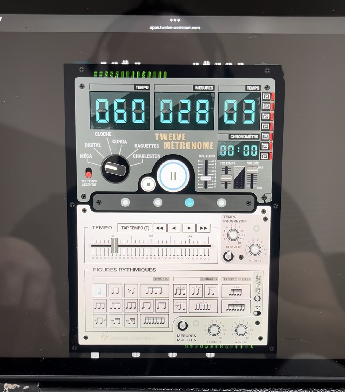 Sur mon iPad que j’ai mis à jour et iphone lorsque je met sur Play sur le métronome ça ne démarre pas et m’affiche un nombre de mesure aléatoirement incohérent (allant même dans les centaines) et pareil sur les temps, en restant sur un chronomètre à 00:00. Quelques secondes plus tard la page se rafraîchit toute seul et ainsi de suite. J’ai essayé sur Firefox ainsi que Google chrome et c’est le même problème. Merci !