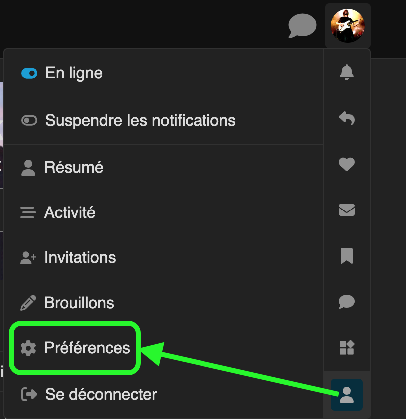 le menu user en haut à droite > Dernière icone Profil > Préférences